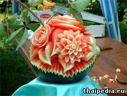 Тайская школа совершенствуется в цветочных мотивах, а китайские мастера традиционно вырезают из фруктов мифических существ, сцены из легенд и народных сказок.